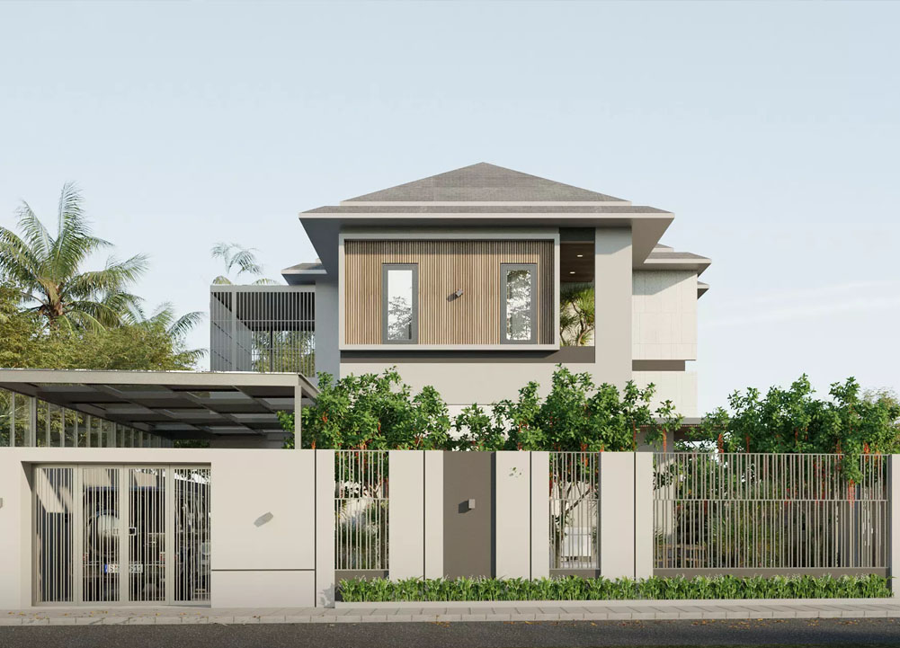 Nếu gia chủ muốn giữ nét gần gũi thiên nhiên, bảng màu này là lựa chọn lý tưởng. Màu be sáng làm nền ấm áp, kết hợp cùng các chi tiết gỗ nâu tạo chiều sâu và mái xanh rêu hòa hợp với cảnh quan sân vườn.